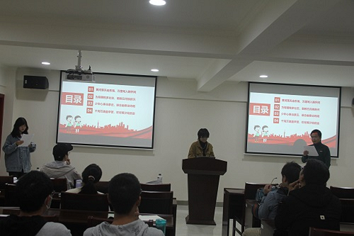 会议由班长王海源,团支书刘驰主持,两人就选取的话题:“理想信念”进行讲解,分别从“何为理想信念”,“从近代到现代人们理想信念的发展变化”,“理想信念的意义”以及“我们该拥有怎样的理想信念”四个方面展开论述,并在每个部分开头以一句诗对其进行概括,大大增加了会议整体的文化氛围。会上,为了让同学们感受过去英雄们的艰苦,化四班委们还提前准备了冻土豆块给同学们品尝,使同学们身临其境地去体会过去战士们的不易。