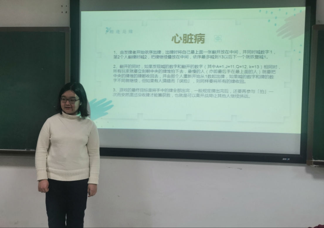 化学1904班在2021年12月2号晚19时于研究生院楼A206开展了“我的1/2”主题心理团辅活动,本次活动由辅导员于哲老师指导,心理委员王溪阅主持,组织宣传委员付佳琪记录,化学1904班应到27人,实到24人。