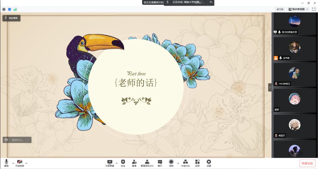 会议于4月17日晚上19点30分结束。通过这次会议1903班对两周的网课生活进行了总结。同学们分享了自己的感受,刘强老师详细了解了同学们的学习情况和思想动态,并提出了宝贵的建议。