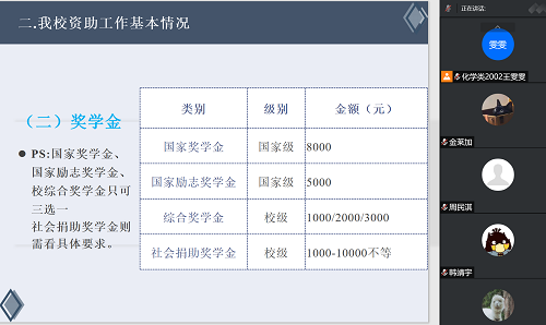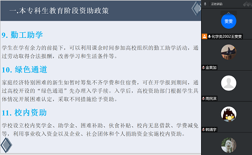 首先,王雯雯同学向大家介绍了资助工作背景及本科生教育阶段资助政策。同学们了解到目前资助投入大幅增加、资助政策体系不断完善、资助管理不断规范等基本情况。