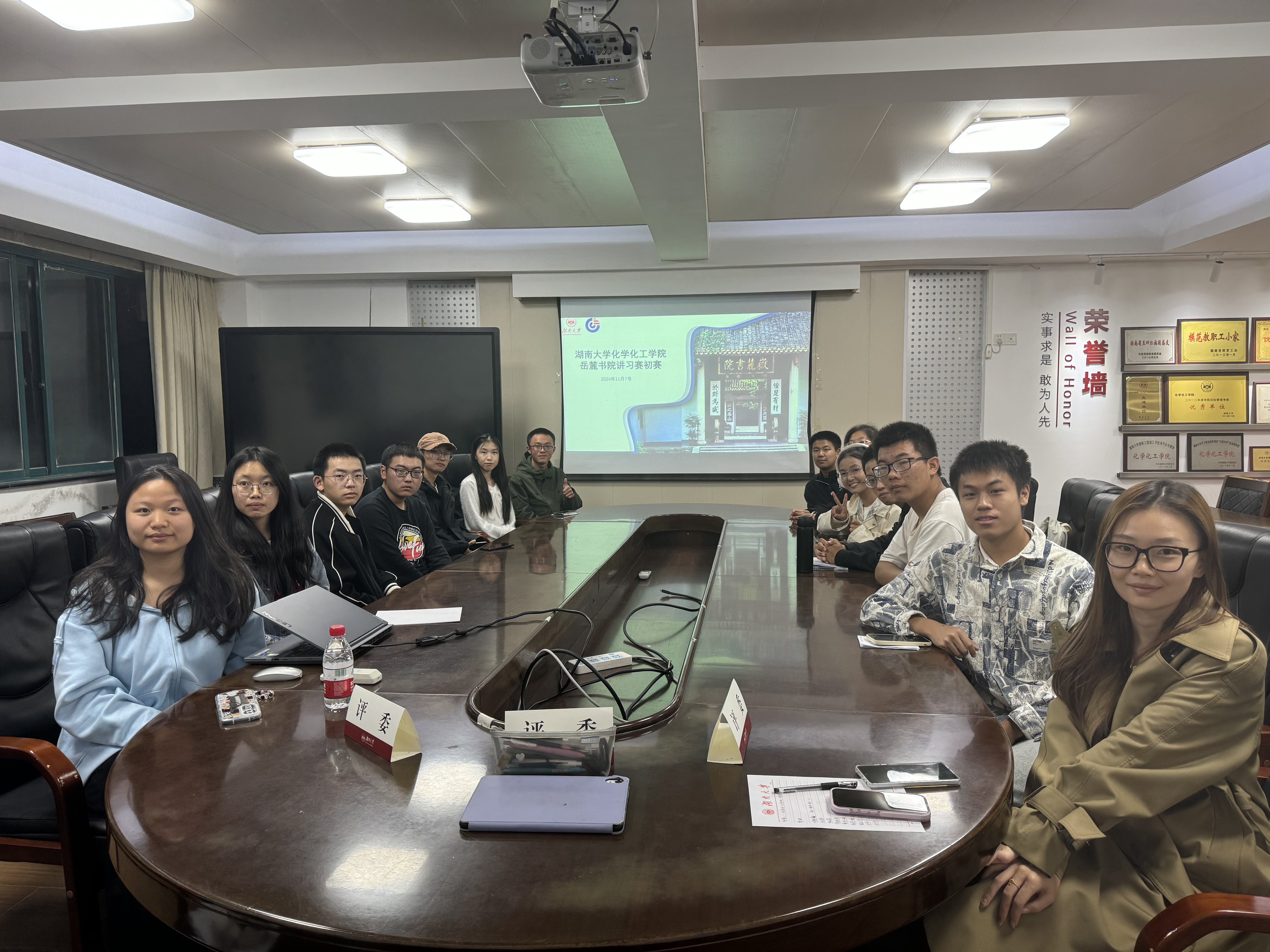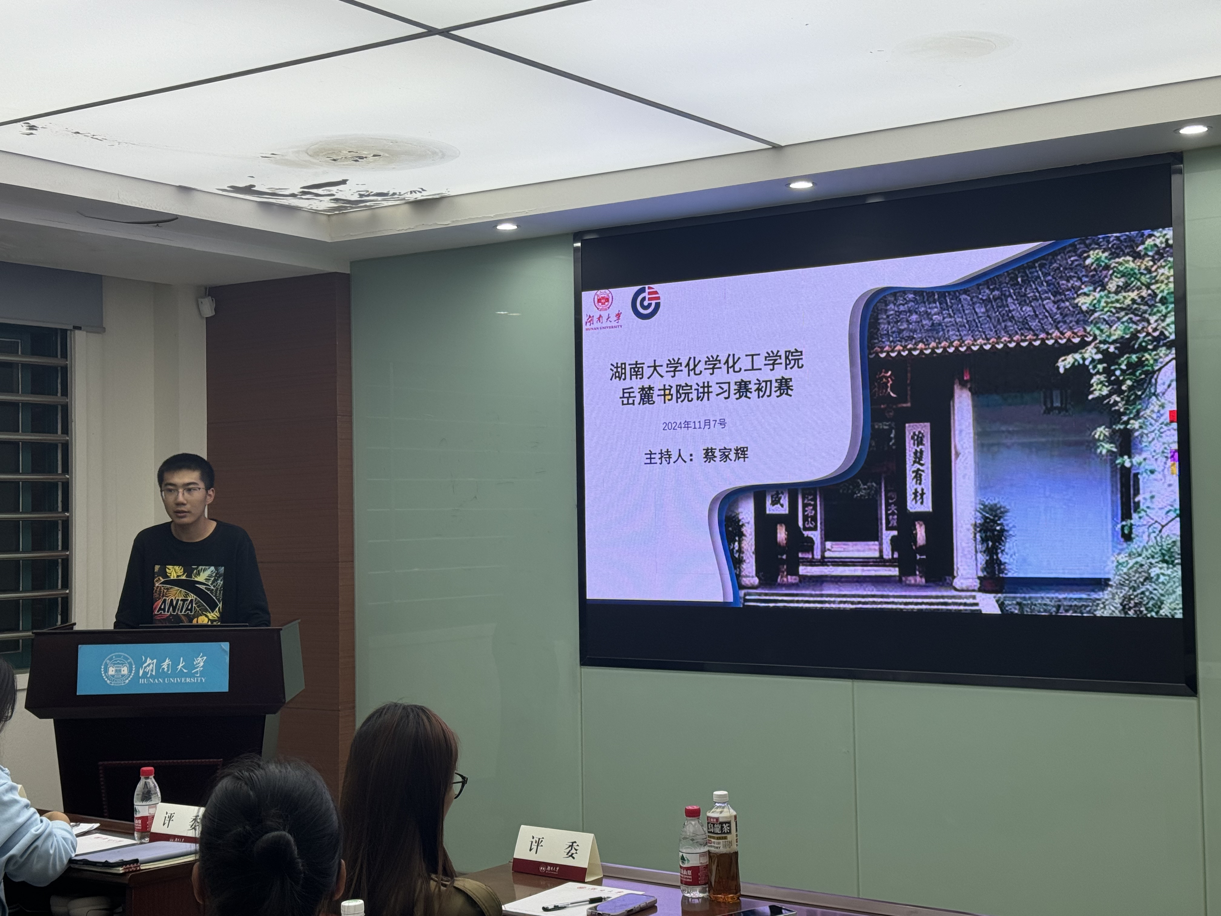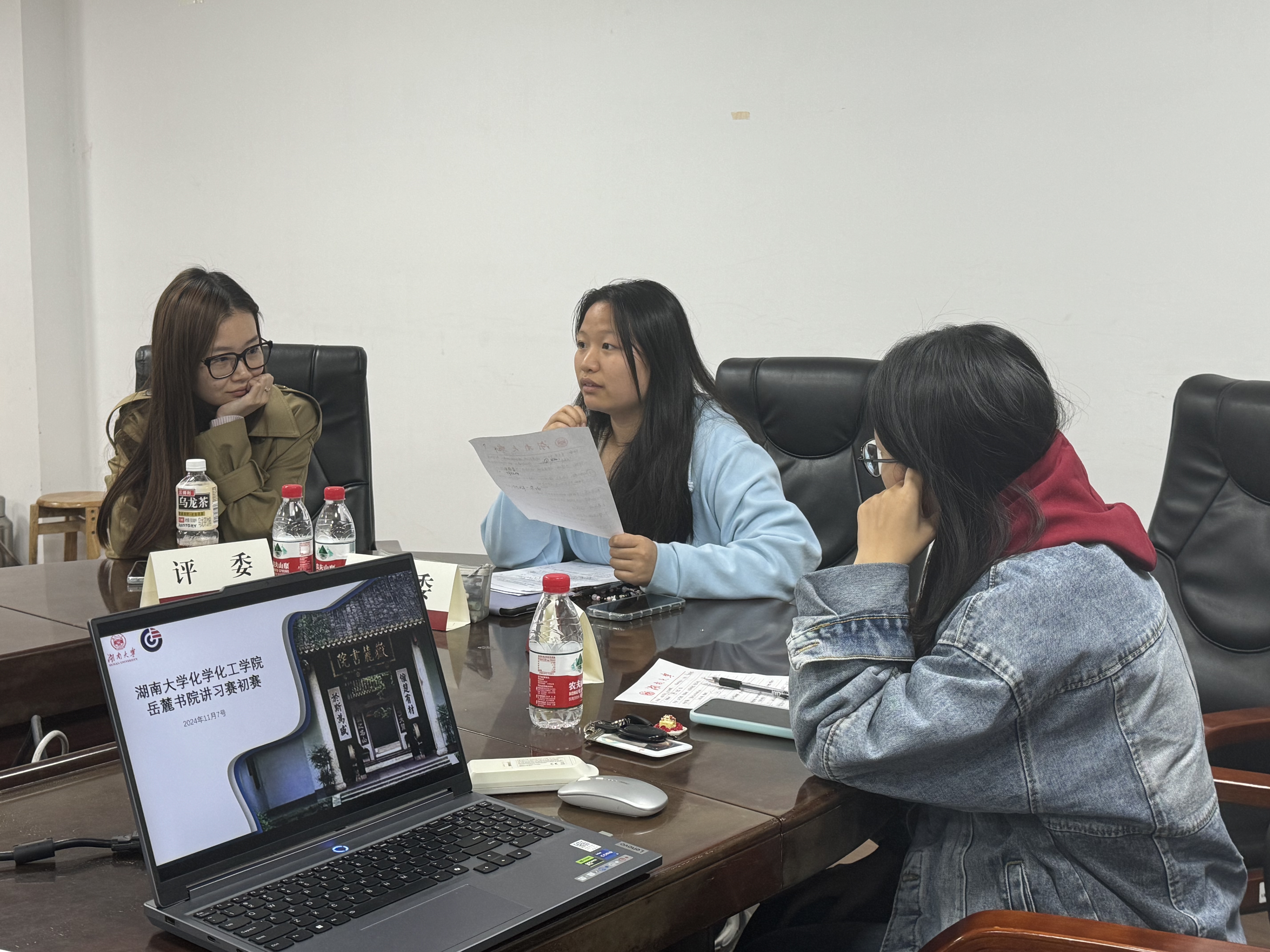 在新化工楼B106举办了2024级岳麓讲习大赛初赛。2024级本科生辅导员王嘉琪老师、化工2301班饶娅琴、化学(强基计划)2301班李金玲三人任评委。比赛由2024级年级会活动股长蔡家辉同学主持。