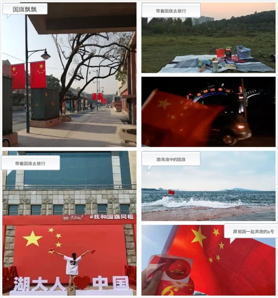 研究生会重磅推出“我和我的祖国”特别征集活动,活动分为两个板块:“带着国旗去旅行”和 “声影中的家国情”,鼓励化工院全体硕博士研究生在国庆外出旅行途中、湖大校园内带有国旗的瞬间定格下来,以及国庆档观影后的所思所想进行投稿分享,共同为祖国庆生!