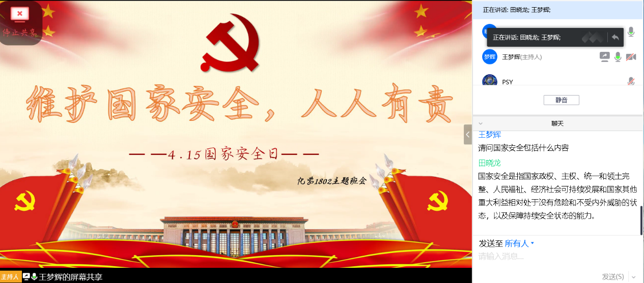 学院依托“平安湖大在线”公众号开展工作,通过研究生会、学生会、年级会、各班班委会、各党支部组织学生以班级、党支部及团支部形式参与到国家安全教育系列微课学习中去,同时要求各单位对学习活动进行充分策划,以主题“云”班会、团日活动、党日活动等形式组织开展在线研讨活动,并依托微课留言区和国家安全知识“答题/竞赛”专栏进行交流、分享,加深学院全体同学对于国家安全知识的了解。
