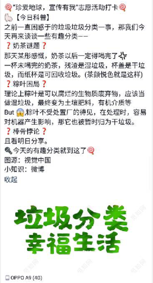活动第一期报名,不到半小时就已招满宣传志愿者。本次活动主要通过志愿者利用网络媒体QQ,微信等进行图文宣传,紧紧围绕“珍爱地球,人与自然和谐共生”这一主题,自主选择专题板块进行宣传。第一期的活动专题分为三个部分:培养环保小习惯,科普环保小知识,环境治理成功典范。活动第二天就收到30余篇优秀作品。在“培养环保小习惯”专题中,化工院同学以数据形式向大家展示了一度电的些作用,通过化学原理介绍了淘米水浇花的好处;在“科普环保小知识”专题中,同学们图文并茂地介绍了世界地球日的创立背景,科普了环保中的冷知识如网购背后惊人的碳排放,各国制定的“怪异环保法”;在“环境保护成功典范”专题中,同学们介绍了实名制矿泉水的两会提案,稻壳谷绿色轮胎等等。除此之外,还有同学们自创专题“宇航员视角下的地球”带同学们领略俯瞰地球之美,以及垃圾分类冷知识教会同学们学习奶茶杯,粽叶的“垃圾属性”。