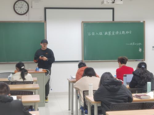 在班会开展前,班长与团支书整理大学生应征工作的相关政策及应征条件。主题班会正式开始,班长开篇即指出了本次班会的意义,指出投身军营,参军入伍,是每个适龄公民应尽的责任和义务。接着班会播放了2020年征兵公益宣传片,进一步激发学生对军人这一职业的崇敬与向往。然后由班长对大学生征兵工作进行政策解读,并对学习、就业、经济补贴等方面政策进行了详细的解释说明,让同学们对征兵政策有了进一步的了解。之后再由班长对大学生入伍发表自己的认知与看法。班长指出:就大学生而言,应征入伍是一件“发展上有帮助、就业上有保障”的可喜之事。同时,在部队熔炉里,既可以锻炼当代大学生的家国情怀、责任担当和吃苦耐劳的意志品质,又可以培养敢为人先、积极奋斗、永不言弃的精神风貌;体验部队生活将成为我们一生难忘的回忆,即可收获部队友谊和坚定意志,又有助于养成雷厉风行、严谨细致的工作作风,对未来的工作与学习都大有裨益。最后,班长希望广大有本班同学能积极响应党和政府的征兵号召,把个人理想抱负融入强军梦、中国梦,踊跃报名应征,到部队中成长和锻炼自己,为国防事业贡献力量。