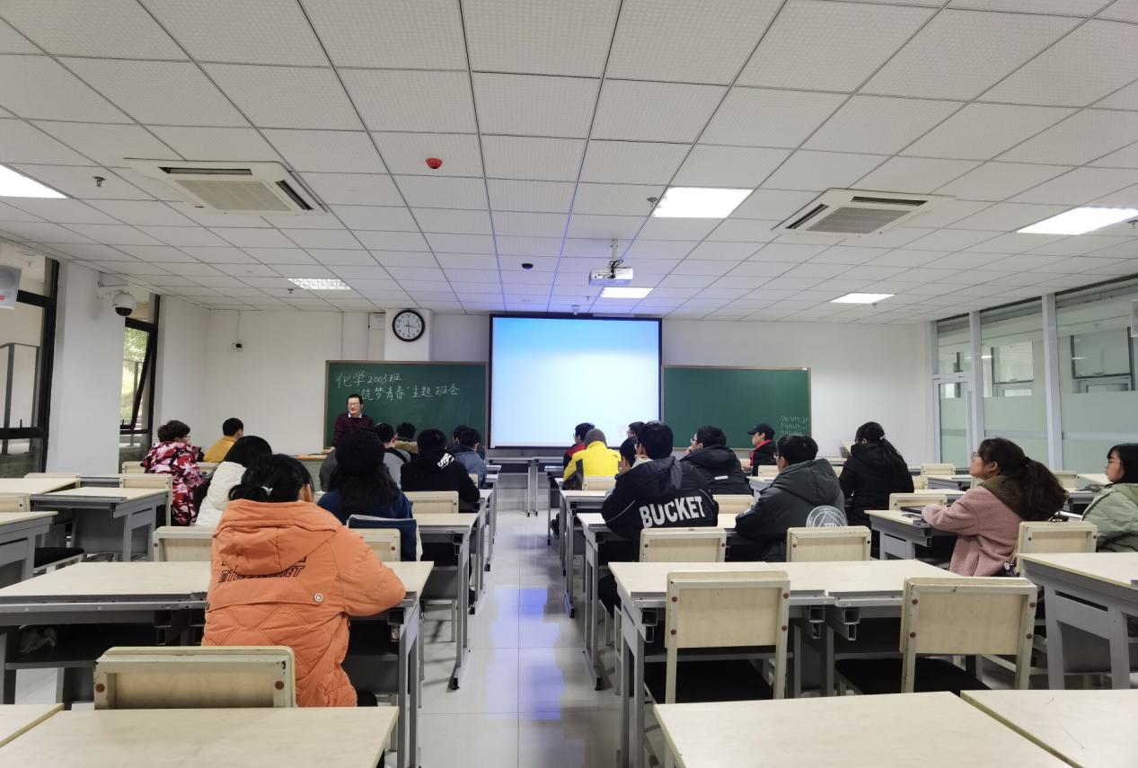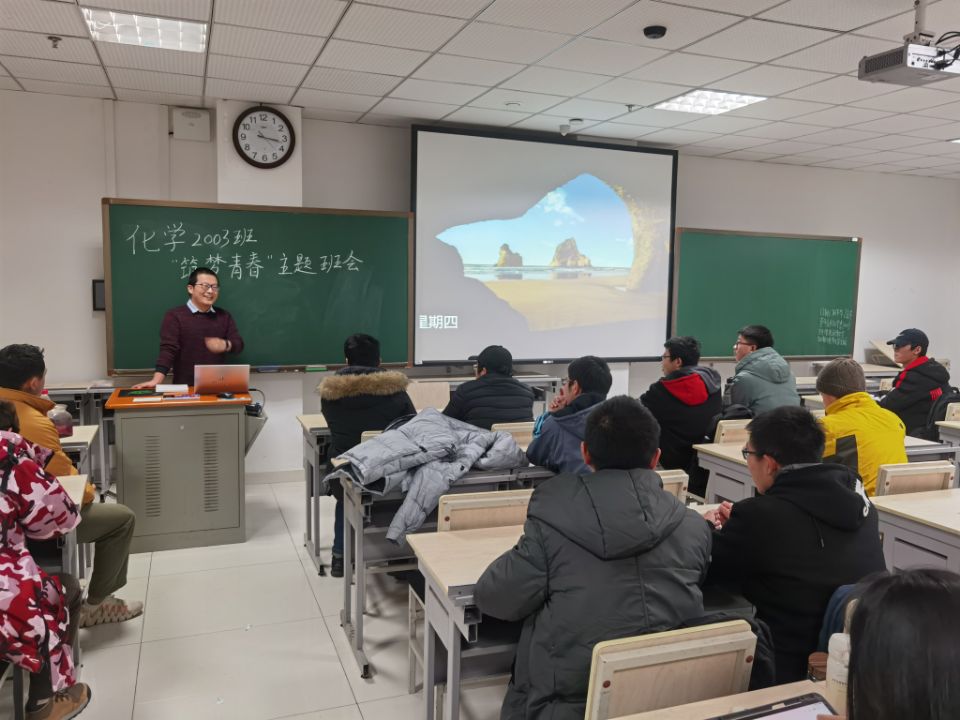 化学类2003班于12月21日下午2点30分,在研究生楼A104教室开展“筑梦青春”主题班会活动。本次活动由团支书李珂瑾主持,班主任李昆老师、化学2003班全体成员参加。