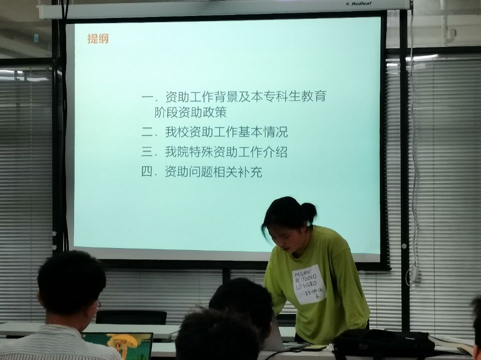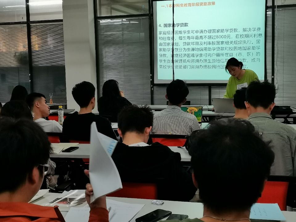 随后,王亚楠同学就资助工作背景,我校资助工作情况和相关问题进行了具体介绍,主要介绍了与同学们息息相关的奖助学金,国家助学贷款,资助政策与内容,资助审评工作流程,勤工助学兼职岗位,公益岗活动等等。同时,她也与同学们分享了自己曾参与的公益岗活动,同学们也感受的活动的趣味性和具体内容,之后,王亚楠同学提醒在库生参与公益岗活动,鼓励同学们积极参与。