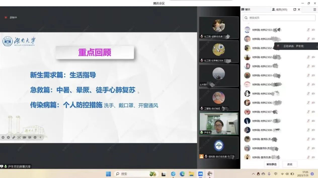 、法学院、工商管理学院等多个院系联合举行,共三百名新生助理参会,培训内容主要围绕新生生活需求、急救及传染病的防护措施展开讲解,尹冬芳老师综合运用图文事例及视频,为大家生动讲述新生应当如何适应长沙的生活,如何使用医保、以及班助带领新生看病的流程。然后尹老师讲解了面对中暑晕厥以及扭伤如何急救,各种传染病及其相对应的防护措施,以提高新生助理的急救意识和自救互救能力,并解答了由新生助理提出的,如何帮助新同学快速适应新校园生活的各类问题。最后,尹老师谈到传染病一直是影响人们身体健康的重要因素,并强调关于传染病的早期筛查、接种疫苗、及时治疗等环节的必要性。如遇确诊新生,新生助理需要及时引导其就医以及做好相应的心理辅导。