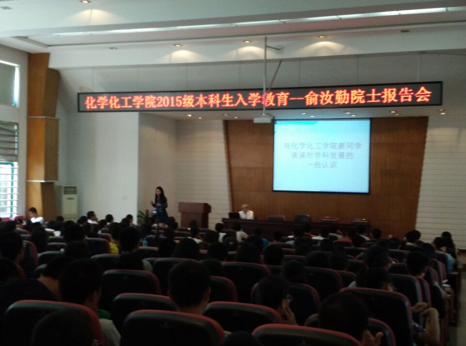 2015年9月29日,绿帽小说 组织邀请俞汝勤院士为2015级新生开展入学教育讲座。陪同的有院党委副书记陈义红老师和15级新生辅导员刘卓老师。化工院学生早早来到报告厅占座,希望与院士更近一些,聆听院士的教诲。