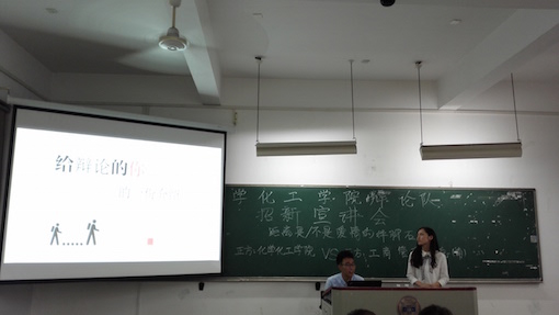 精彩绝伦的表演赛推动了宣讲会的顺利开展,辩论队领队丛珊珊同学解释了辩论是什么,辩论能带给你什么,辩论需要的是什么等新生们常见的问题。丛珊珊同学从自身的经历出发,谈起自己当年第一次打辩论时的紧张不安,准备辩论赛时的辛苦疲惫,赛上遇到强大对手时的手足无措。她从开始的青涩到现在的成熟,在辩论中她收获了许多,也成长了许多。她也惊喜地发现,自己不仅懂得了辩论,也增加了学识,还学会了主持、演讲、面试。她为辩论付出了诸多汗水与心血,而辩论也给了她一切。最后,丛珊珊同学鼓励新生们积极报名辩论队,争取让自己在辩论队里得到更加充分的锻炼。