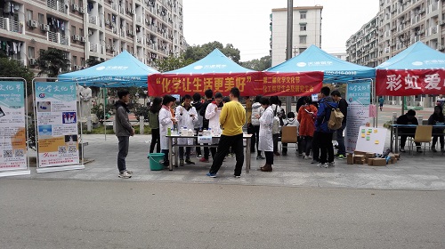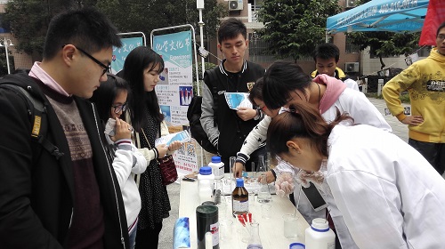 此次开幕式中的现场实验演示引来了路人们的充分关注。“蓝瓶子”实验可以将烧杯里的液体在蓝色和无色之间任意转换,“大象牙膏”实验是通过加入洗衣液形成巨大的“牙膏”,“可燃冰”实验能够让人看见“冰块”着火这一神奇的实验现象,而“雪花飘飘”则是天气瓶的制作,瓶中绚丽的雪花晶莹如玉。围观实验的同学们纷纷惊叹于化学的神奇之处,感受到了化学在生活中的乐趣。有的同学看完实验之后跃跃欲试,并在志愿者的指导下完成了一些简单的实验,他们动手实践之后更加切身体会到了化学实验的独特魅力。精彩绝伦的实验让同学们对天气瓶的制作和课桌文化大扫除活动产生了浓厚的兴趣,因而活动现场的招募也得到了同学们的积极响应和大力支持。