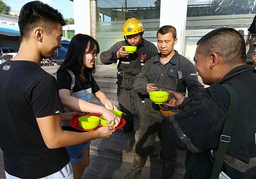 从矿井里上来的工人正如之前工作人员向团队介绍的一样,满面尘土,身上也黑乎乎的沾上许多煤灰。但是出于意料的是,虽然他们经过了一夜的辛苦工作,却并没有显现出太多的疲态,有些矿工直接坐在服务站外的台阶上,有说有笑地享受着清晨的阳光。在黑暗的矿井下连续工作近十个小时后,每一缕阳光对他们来说都显得弥足珍贵。队员们依次为进入服务站的矿工们端上汤并向他们致以问候表达了自己的敬意。在经过简短的交流后,队员们了解到了即使是现代化的马脊梁矿,地下工作条件也很艰苦。听完矿工们大致介绍完自己的日常工作环境和时间安排后,对矿工们吃苦耐劳的精神的敬佩之情不禁在队员们心里油然而生。
