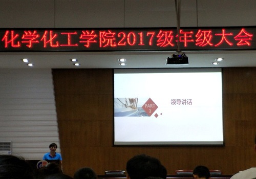 19点整,化工院2017级全体新生在各班班长的带领下有序进入会场,会议由军训负责人刘凯泓同学担任会议主持。