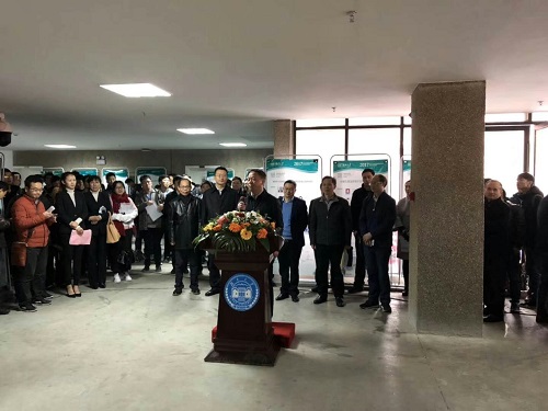 副校长谢赤教授为开幕式致辞,万众注目中,校长段献忠教授宣布成果展开幕。