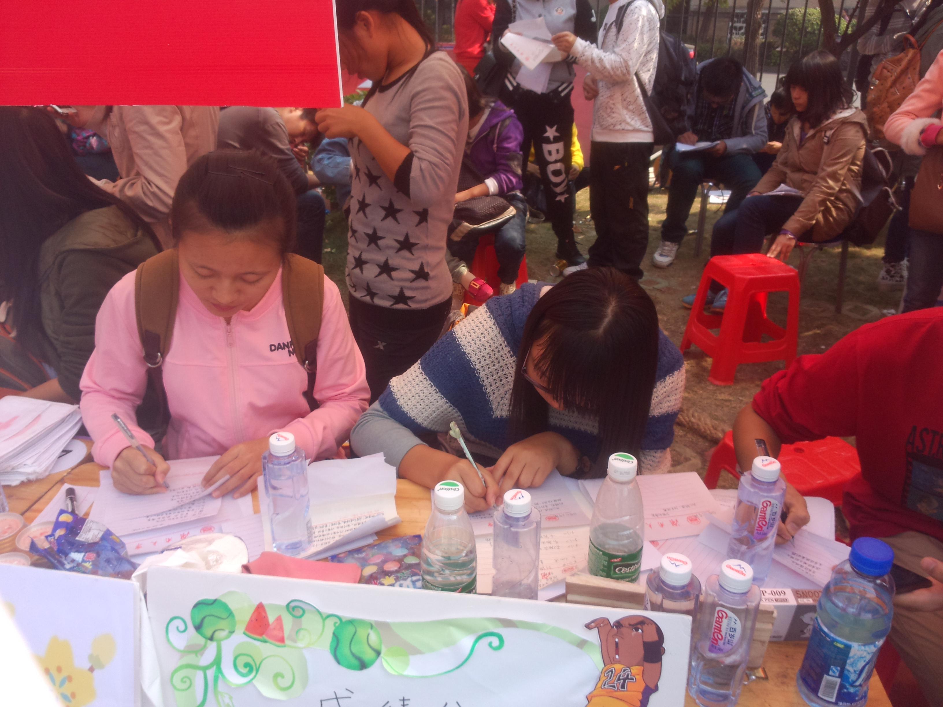 在方队表演结束后,志愿者与新闻部同学开始着手准备为运动员的加油词,他们时而紧咬笔杆或低头沉思,但是在志愿者们的努力下,很快加油词就写了许多保证了在需要的时候为运动员们加油,鼓气。