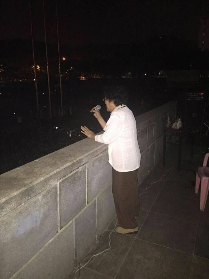 七旬退休老师彭小平老当益壮,站在体育馆高台处亲自教授百十余学生唱军歌。