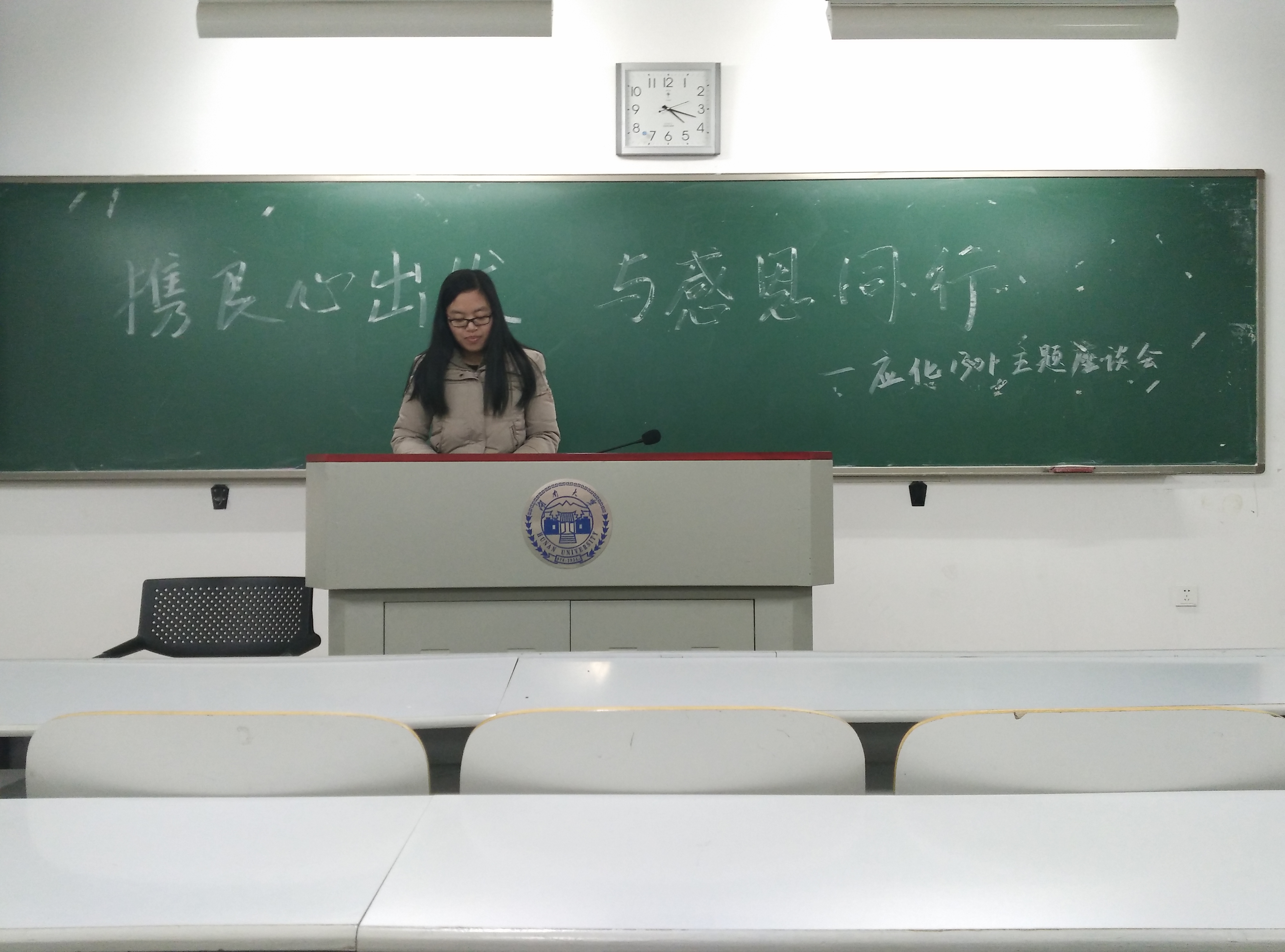 活动分为三个部分。第一部分,同学们讨论有关感恩的节日,包括重阳节、母亲节、感恩节等,相互交流了在这些节日里做过的与感恩有关的事情。班长王莹菲统计了每个月班上同学与家人打电话的次数,发现几乎所有同学都和自己的父母有很好的联系沟通。同时,她也分享了自己与爷爷奶奶相处的点点滴滴并提醒在与父母沟通交流的同时也不要忽略了老人。活动的第二部分是同学们在现场表达感恩之情。大家有站起来向室友表达感谢的,也有打电话向父母表达感恩之情的。值得一提的是来自内蒙的韩淑珍同学,她用蒙语对多年的好友表达了感谢,虽然有语言上的隔阂,但是却能真切感受到她情感的真挚,在通话的最后,她的好友用汉语对她说了“我爱你”,让大家感慨良多。活动的第三部分是由团支书起草《感恩倡议书》,经大家讨论最终确定,并打印分发给教学楼里的湖大学生。倡议书从细节着手,提出从小事做起的感恩方式,特别提出了感恩保洁人员,倡议大家随手带走座位上的垃圾,给保洁人员减轻负担。