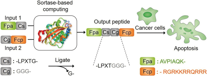 生物计算作为一个信息处理工具在多参数传感和生物医学方面显示巨大的潜力。长期以来,生物分子逻辑门获得了科学界的广泛关注,然而在以往的研究中,大多数的工作都还局限于DNA分子逻辑门,而多肽逻辑门却因其氨基酸残基多样且复杂的化学性质而鲜有报导。因此,亟需开发一种通用型多肽生物逻辑系统,执行更复杂而精准的逻辑调控。日前,我校绿帽小说 、化学生物传感与计量学国家重点实验室聂舟教授研究团队报道了一种新颖的复杂多肽逻辑系统,将转肽酶Sortase A作为通用生物处理器,成功实现了细胞行为的调控。