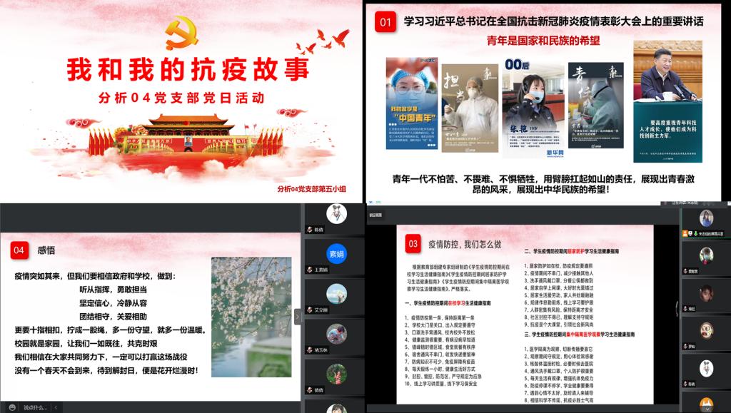 分析04党支部开展“我和我身边的抗疫故事”线上主题党日活动。会议邀请抗疫一线工作者徐晓宇老师和王倩倩老师参加。此次会议由支部书记艾立丽同志主持,支部全体党员参加。