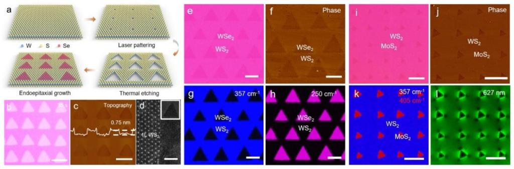 段曦东教授课题组在国际顶级期刊Nature Nanotechnology在线发表题为“Endoepitaxial growth of monolayer mosaic heterostructures”的研究论文,该研究报告了一种激光加工、各向异性热刻蚀联合精准面内外延的通用制造策略,制备了具有原子级锐利界面的单层过渡金属硫族化合物(TMDs)面内镶嵌异质结阵列。文章发表后,北京大学刘开辉教授对该研究论文进行了专题亮点报道评述,并于4月20日在线发表于Nature Nanotechnology上。