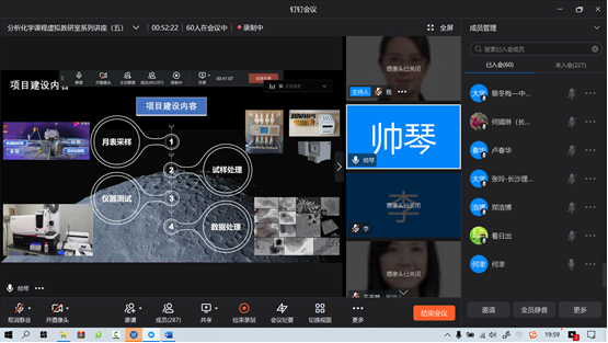 地球观测与信息提取的新理论、技术和方法也属于“十四五”NSFC地球科学部优先发展领域。因此,分析化学课程在地质行业人才培养中的重要地位日益凸显。帅琴教授对本校分析化学课程团队如何结合地质大学人才培养特色及行业需求,紧扣服务国家资源战略和国民经济主战场主题,以提高教学质量建设一流课程为宗旨,进行《分析化学》课程群系列课程建设做了详细介绍。提出根据不同专业需求设计分层教学,结合行业需求补充课程内容,拓展课堂外资源延伸课程边界,创新教学手段推进数字化进程,开展基于探月工程的月壤组成和性质分析虚拟仿真实验研究等课程建设的创新思路和有效举措。介绍了如何结合案例分析,采用翻转课堂、对分课堂等课堂讨论方式,激发学生的潜能,提高综合能力。来自分析化学课程虚拟教研室和化学类专业基础理论课程虚拟教研室的六十余位教师参与了本次教研活动。教研交流最后,国家教学名师、绿帽小说