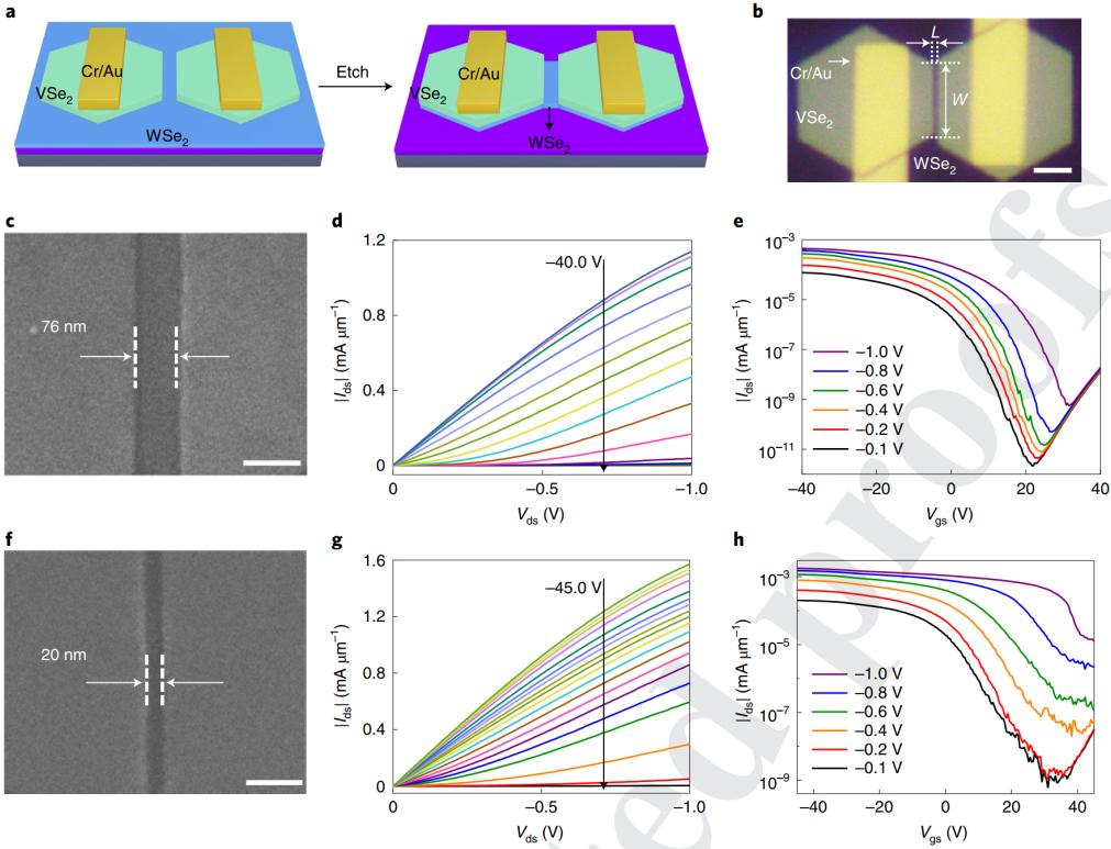 段曦东教授课题组在国际顶级期刊《Nature Electronics》在线发表题为“Bilayer tungsten diselenide transistors with on-state currents exceeding 1.5 milliamperes perMicrometre”的研究论文。