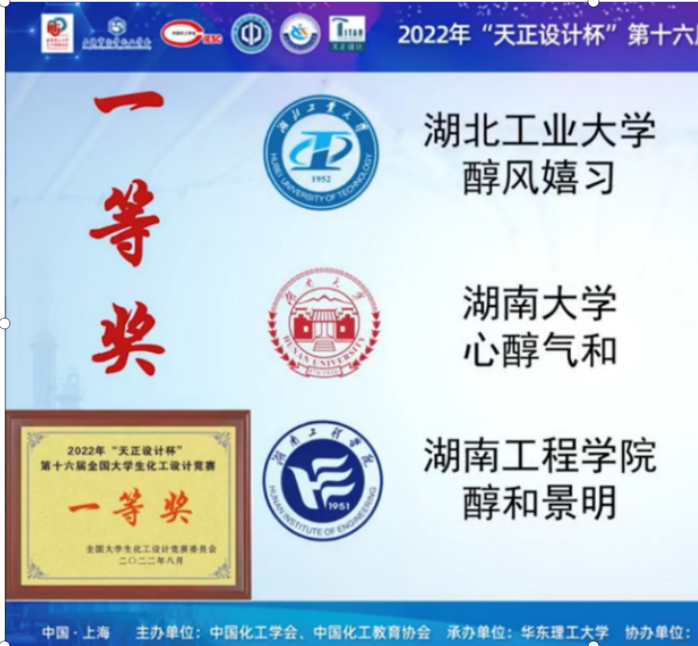 获第十六届全国大学生化工设计竞赛总决赛一等奖