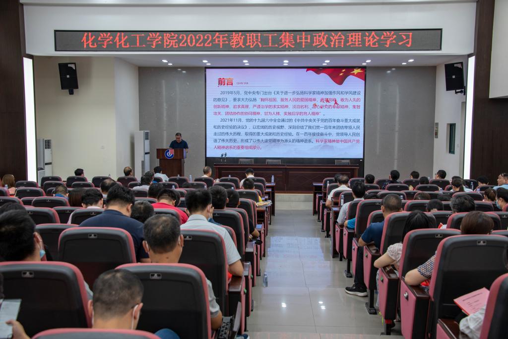 在新化工楼D区报告厅组织开展了2022年教职工集中政治学习。本次主讲嘉宾为国家重点实验室副主任刘松,领学主题为《弘扬科学家精神 做新时代追梦人》,学院全体教职工参与学习。
