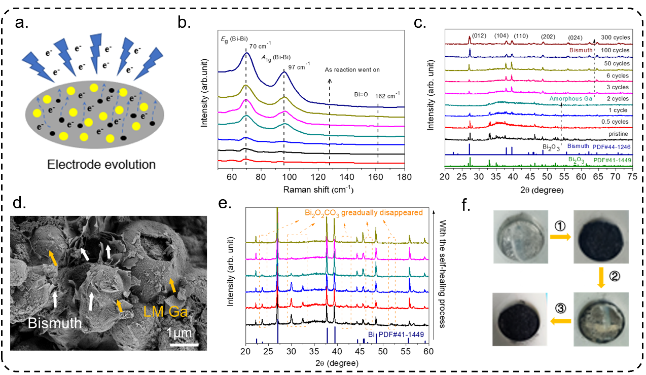 该团队通过以液态金属为分散剂,利用电场诱导纳米催化剂发生可控演化,制备了新型铋剂液态金属电极,并展示了其在电催化二氧化碳还原领域应用。当铋催化剂因长时间工作而发生失活时,通过原位电化学重构手段实现了催化剂失活后的自修复过程。