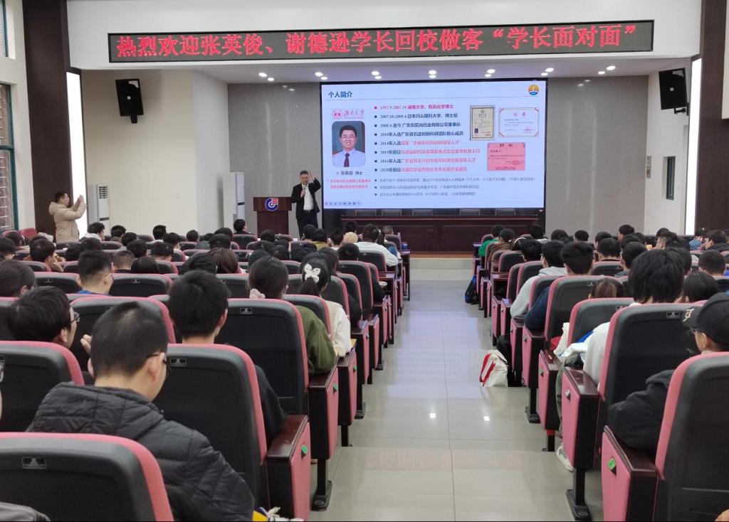 和日本静冈理工科大学的求学经历,介绍了创新药物研发的意义、药物研发的过程以及广东东阳光药业的部分药物研究成果,并鼓励同学们勇于担当,学成本领,为社会发展贡献青春力量。谢德逊学长则分享了在求学、创业过程中的趣事,着重讲述了与母院与恩师之前的深厚情感。两位学长的报告幽默风趣,相互承接,将自己的宝贵经验转化成同学们的成长指引。