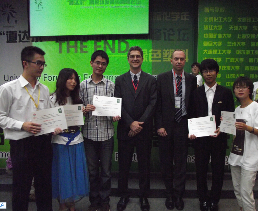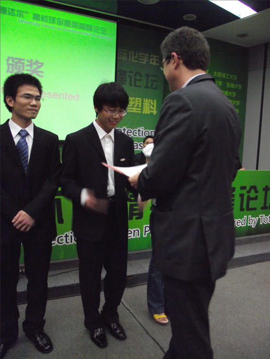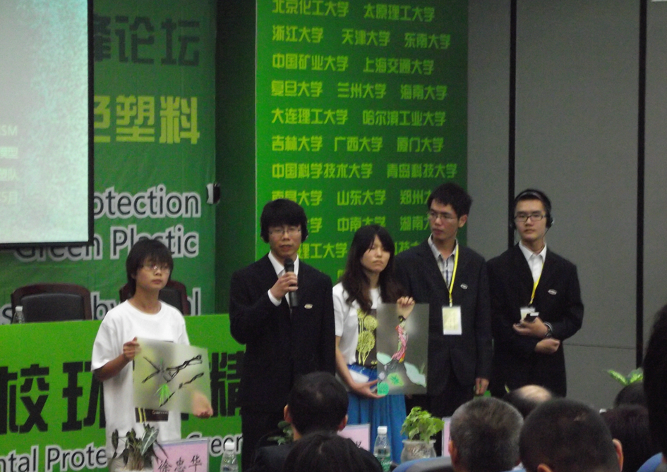 2008级本科生齐云强、朱丽娜、毛冀川、陈家驹、褚蕊、李东洋,2010级本科生汤蓉和我校土木工程学院2008级佘羽8名本科生组成,他们设计的作品“集成绿色环保经济节能大规模回收再利用废弃塑料处理系统社会模型”在论坛中得到了评委和嘉宾们的好评,尤其是独特的“绿点”创意吸引了法国评委们的关注。他们以废旧塑料为材料制作的工艺品《仕女图》、《争春》两幅版画得到了现场观众们的赞许,他们的优异表现给现场的评委嘉宾和各高校的参赛选手们留下了深刻的印象。最终“湘塑”代表队凭借着优异的综合表现在全国16所高校的19支代表队中脱颖而出,以第三名的成绩成为获得金奖的八支队伍之一,为我校争得了荣誉。浙江大学、山东大学等高校的11支代表队获得银奖。