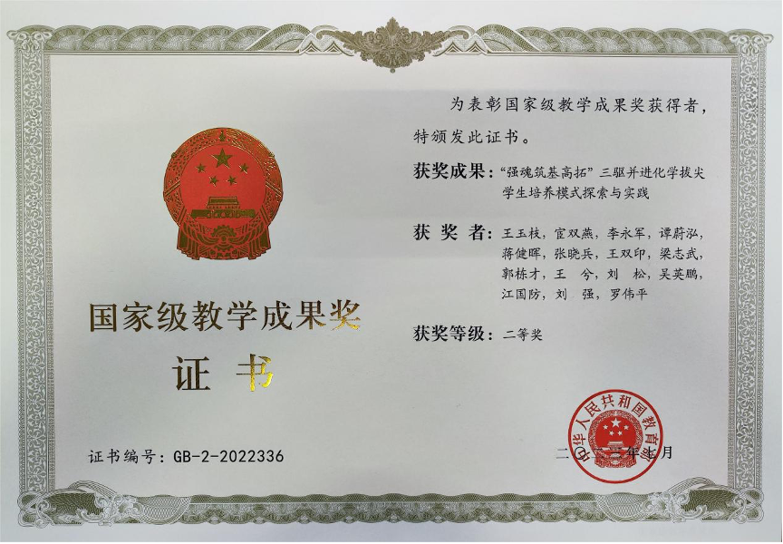 获奖成果:“强魄筑基高拓”三驱并进化学拔尖学生培养模式探索与实践。