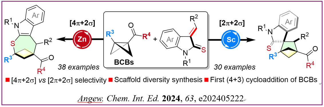 针对双环[n.1.1]烷烃种类不丰富合成难度大的问题,冯见君教授课题组发展了双环丁烷的首例(4+3)环加成反应,并通过催化剂和底物调控实现了(4+3)和(3+2)反应,(5+3)和(3+3)反应的发散可控进行。在丰富双环丁烷环加成化学的同时,为新药研发中对苯环的三维生物电子等排体的刚性需求提供了丰富多样的“菜单”。上述工作在《Angew. Chem. Int. Ed.》上发表,并被主编选为Frontispiz文章。绿帽小说