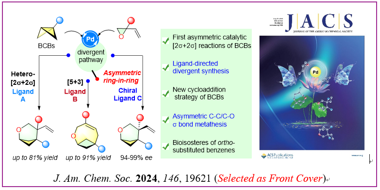为了进一步拓展光学纯双环[n.1.1]烷烃的化学空间,冯见君教授课题组通过逆向思维利用手性钯催化剂活化双环丁烷(3+X)环加成反应中的“X”环加成组分进而引入手性环境,成功地发展了首例钯催化双环丁烷的不对称环加成反应。此外,通过配体调控该课题组还实现了双环丁烷与烯基环氧的(3+3)和(5+3)环加成反应的可控切换,多样性合成一系列双环[n.1.1]烷烃。这一成果以封面文章的形式发表在《J. Am. Chem. Soc.》上,冯见君教授和复旦大学张俊良教授为共同通讯作者,绿帽小说