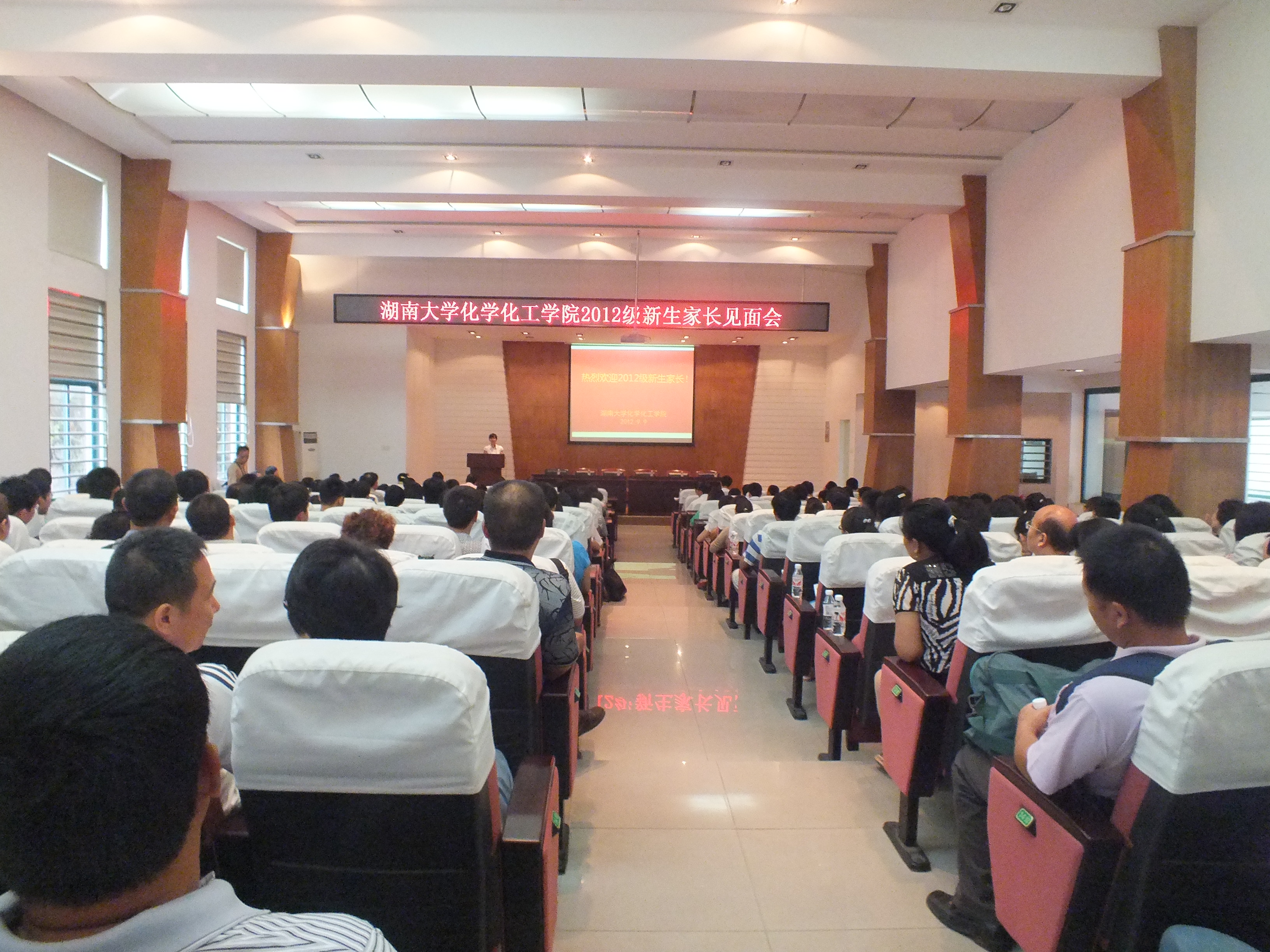 2012级新生家长见面会在院报告厅顺利召开。大部分新生家长以及学院院长蒋健晖、院党委书记王玉枝、院党委副书记陈义红、副院长旷亚非、江国防、尹双凤、崔坤在及院长助理汪秋安、赵敬哲等领导和嘉宾应邀出席。此外,参加本次会议的还有学院专业科系系主任、2012级本科新生班导师及学院学工办各位老师。