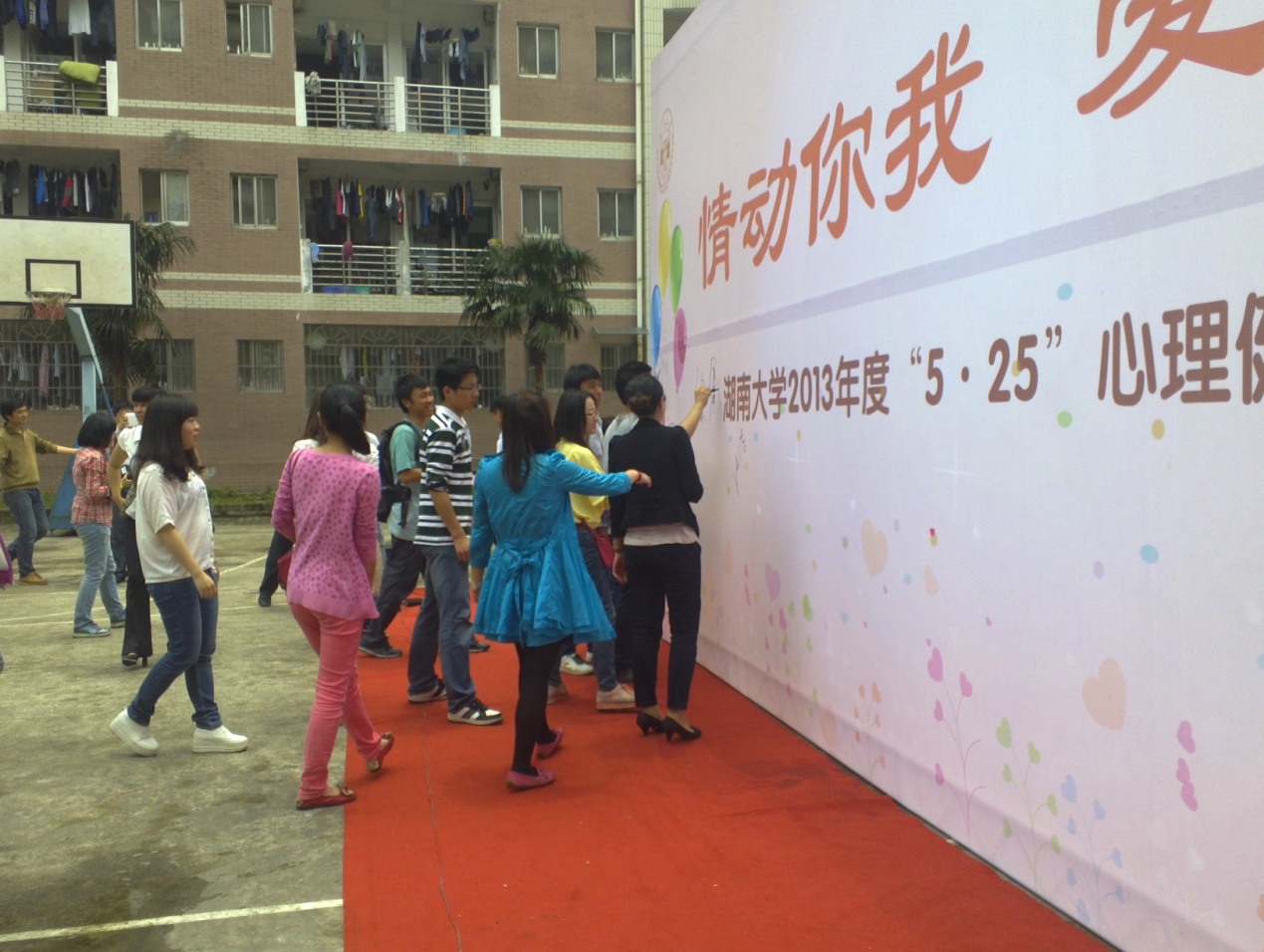 心理健康与生涯发展教育中心老师杨雅雯老师,学生会组织人员以及心理健康与生涯发展教育中心和各学院负责心理健康工作的各位老师和学生。本着“推广积极心理品质的建设,为心理出现困扰的同学排忧解难”的目的,大家共聚天马学生公寓2区篮球场,开展此次意义深长的活动。