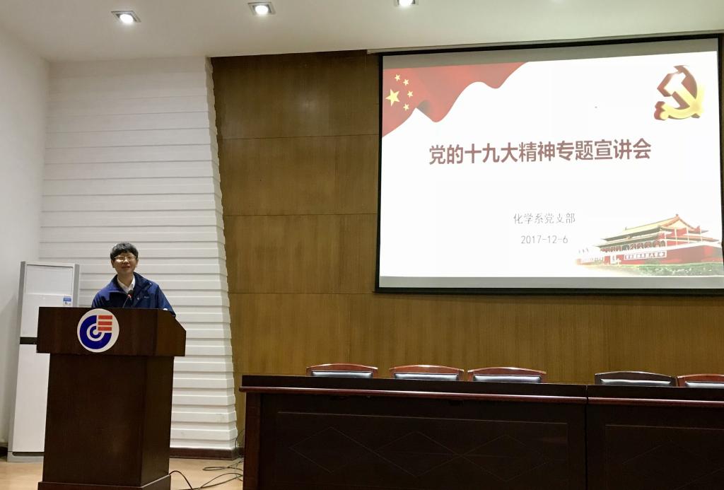 蒋健晖同志分别从会议主题,习近平新时代中国特色社会主义思想,过去五年取得的历史性成就,中国特色社会主义进入新时代的重大意义,我国社会主要矛盾变化的深远影响,“两个一百年”奋斗目标,坚定不移全面从严治党的重大部署等方面,为化学系全体党员系统阐述了党的十九大精神的丰富内涵。