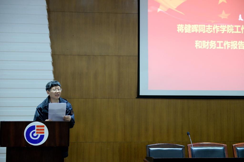 紧接着,蒋健晖院长作题为《乘“十九大”东风,借“双一流”契机,全面推进一流学院和一流学科建设》学院工作报告。报告就2017年学院工作进行回顾与总结,在突出业绩方面,实现NSC(Nature、Science、Cell)论文零的突破,学科排名进步显著,新增省部级科技成果奖一等奖等等;人才培养质量稳步提高,学科综合实力持续提升,师资队伍建设卓有成效,科技研究工作亮点突出,国际交流合作成效显著,党建思政学工不断拓展,管理服务效能不断提升;同时也指出学院2017年工作中存在的问题和困难,对学院2018年的部分重点工作及目标进行简要介绍。蒋院长还做了学院财务工作报告,对学院2017年度财务工作进行了简要汇报。与会教职员工对学院年度工作的满意度进行评价并投票。