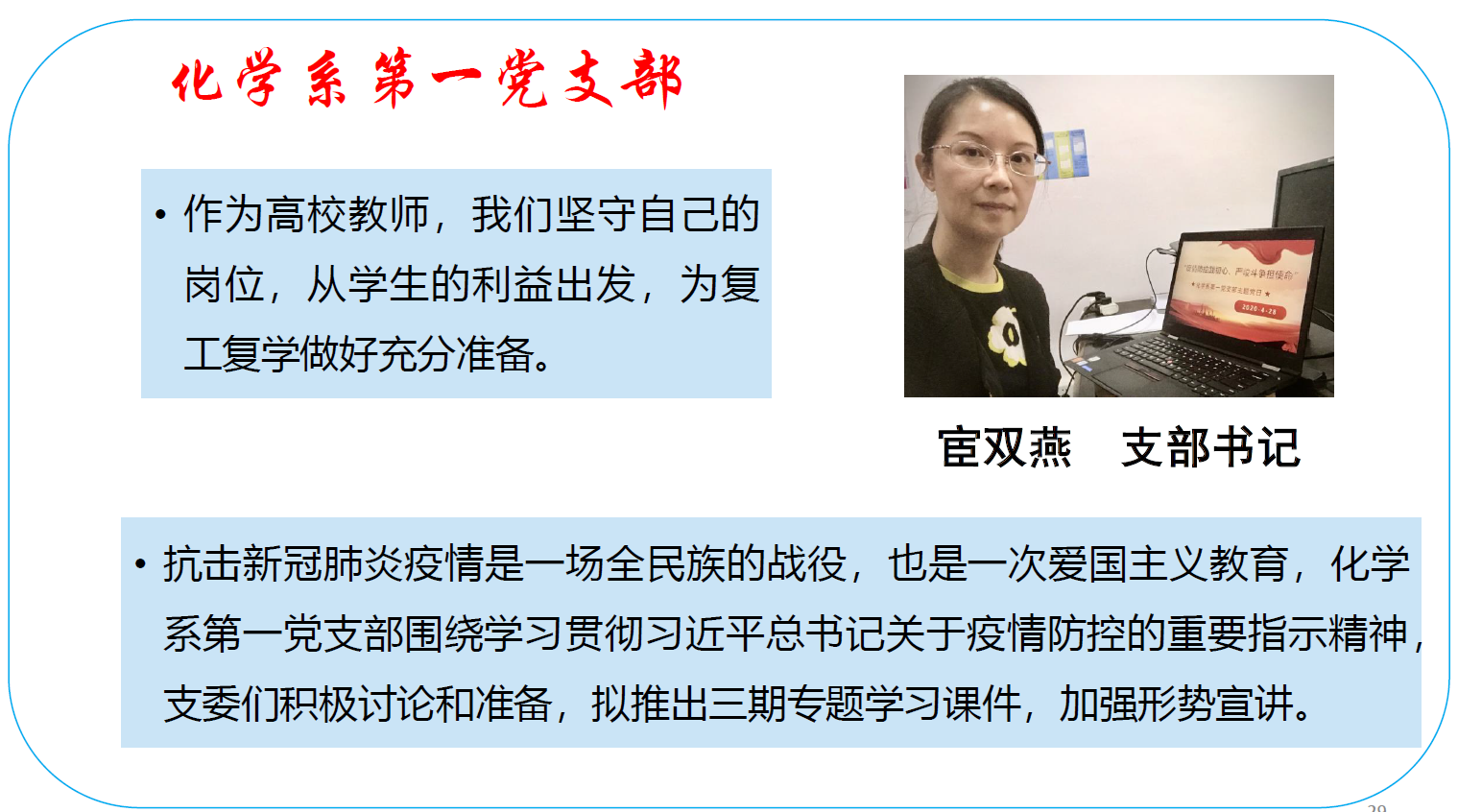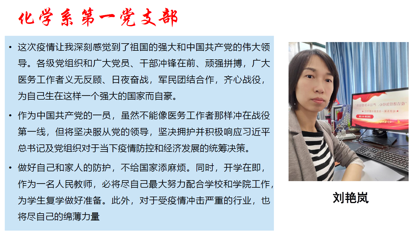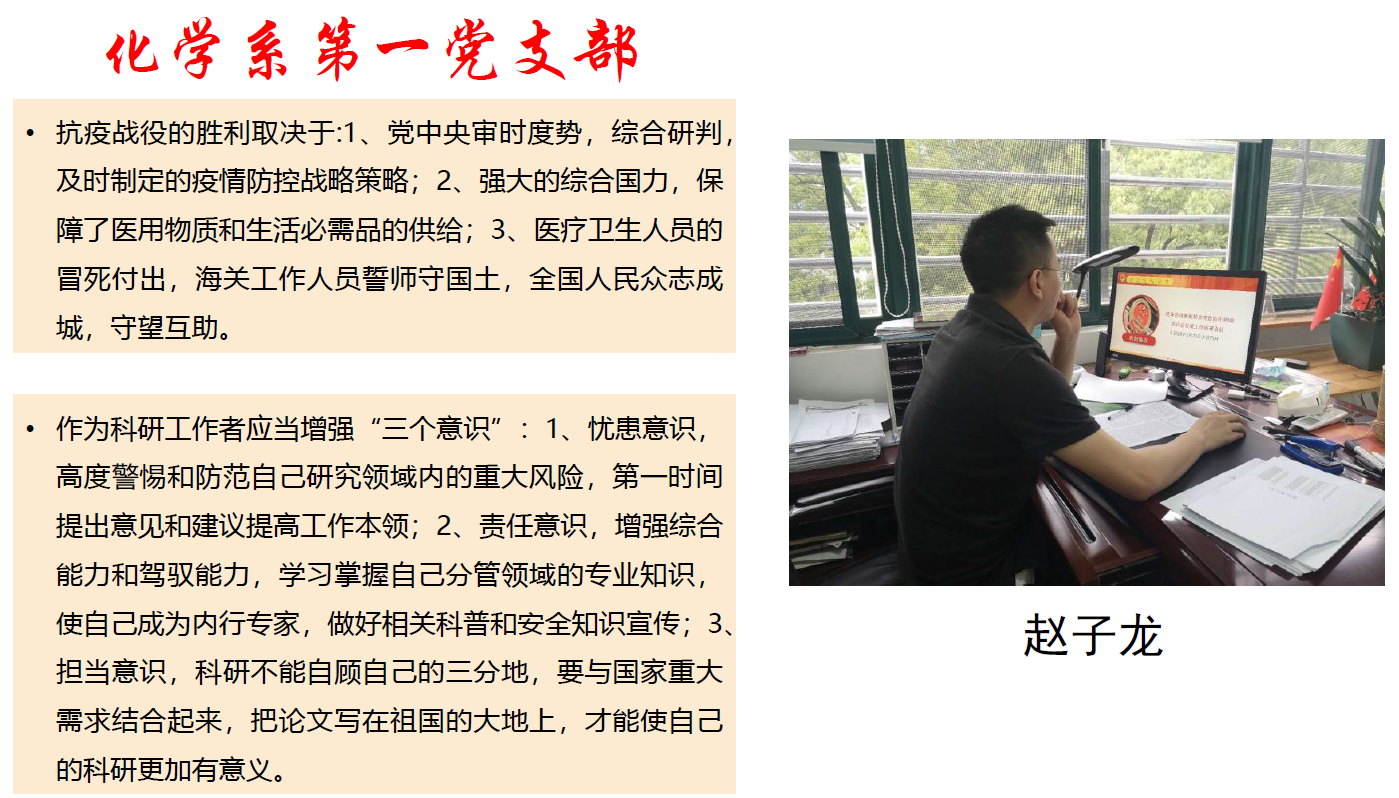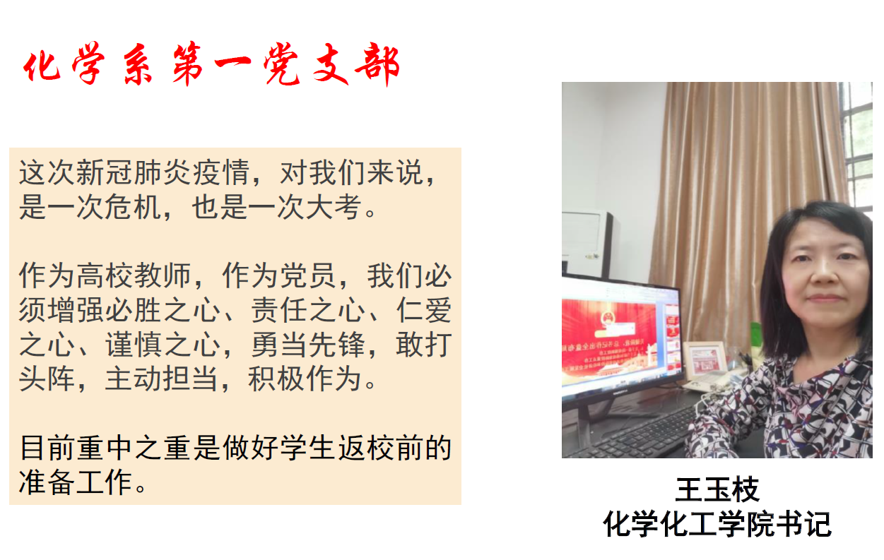 支部书记宦双燕说:抗击新冠肺炎疫情是一场全民族的战役,也是一次爱国主义教育,化学系第一党支部围绕学习贯彻习近平总书记关于疫情防控的重要指示精神,支委们积极讨论和准备,拟推出三期专题学习课件,加强形势宣讲。