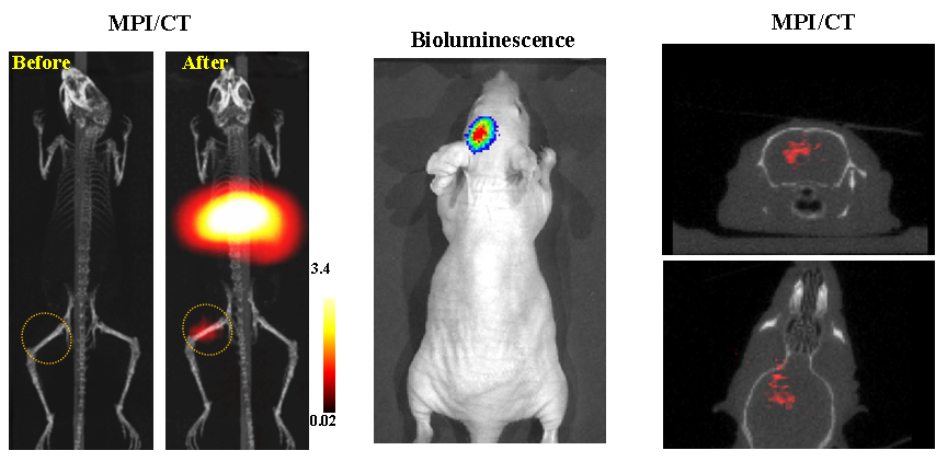 今年二月份,宋国胜教授与斯坦福大学饶江宏教授合作,通过系统的研究获得了影响磁性粒子成像信号的作用规律和关键原理,开发了新型磁性粒子探针---FeCo合金粒子,并首次应用于磁性粒子成像(MPI)。该造影剂在极低含量时(5 ng)仍具有很强的造影效果。这意味着,未来在进行人体成像时,可以使用更小剂量的造影剂,从而避免高剂量造影剂引起的肾肝损伤。基于MPI的直接成像原理,我们可以对造影剂进行正相和无背景干扰的活体成像,极大地提高信噪比。这项技术为肿瘤早期诊断、癌细胞示踪、脑中风、药物输送治疗、肺部灌注成像、胃肠出血、神经退行性疾病、磁热治疗等在活体中的可视化研究,提供了强有力的手段。相关研究成果以绿帽小说