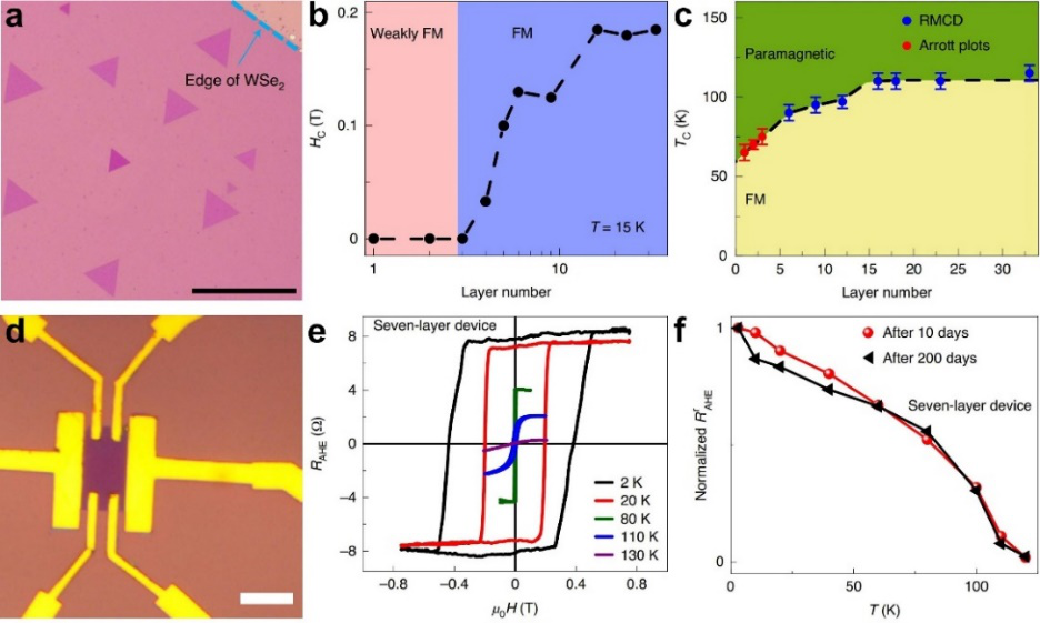 、二维材料湖南省重点实验室段曦东教授团队与中国人民大学、加州大学洛杉矶分校合作,在国际上首次发现CrSe2是具有厚度依赖层间磁耦合转变特性且在空气中高度稳定的二维磁性材料,并记性了化学合成和磁性能表征和解释,这初步克服了此前困扰科学界良久的二维磁性材料空气稳定性不足的困难。相关研究工作以“Van der Waals epitaxial growth of air-stable CrSe2 nanosheets with thickness-tunable magnetic order”(范德华外延生长磁序层厚调控的CrSe2纳米片)为题发表在3月1日在线出版的《自然·材料》(Nature Materials,DOI: 10.1038/s41563-021-00927-2)上,绿帽小说