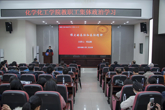 在新化工楼D区报告厅开展了2021年第七次全体教职工集中政治学习。本次集中学习主讲嘉宾为化学系第二党支部书记刘志刚,授课主题为《伟大的长征和长征精神》,学院全体教职工参与学习。